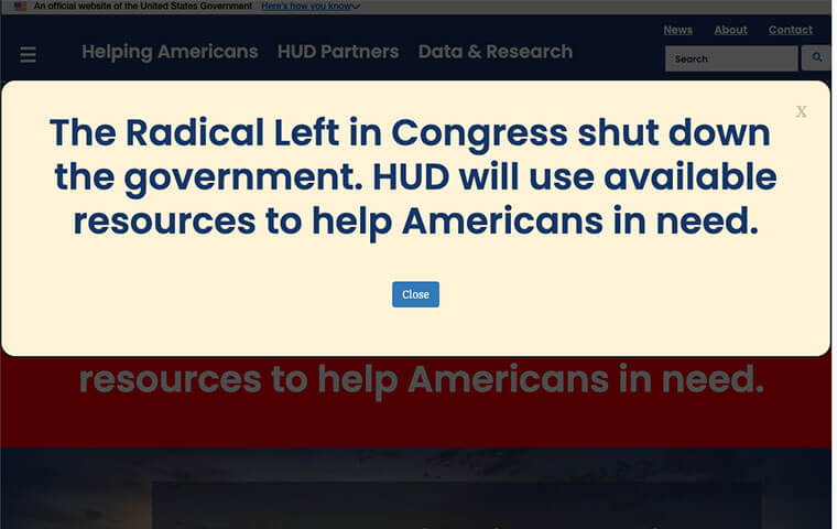 - HUD’s posting on its website reading ‘‘The Radical Left in Con-13gress shut down the government. HUD will use available resources to help Americans in need”; and