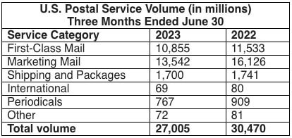 As seen in the chart below, from the August 8 USPS press release, volume was down in all service categories and 11.4 percent overall. Marketing mail was hit especially hard, falling 16 percent.