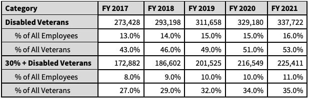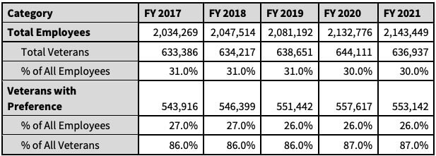 As of September 30, 2021, the 24 Chief Financial Officer (CFO) Act agencies1 employed a total of 636,937 veterans, which comprises approximately 30 percent of the total Federal workforce. The data in this report is a count of all Federal employees in pay status taken at the last pay period or last day of September 2021, a decrease of just 1 percent since Fiscal Year (FY) 2017. However, Table 1 below shows that of the 636,937 total veterans in the Federal workforce for FY 2021: