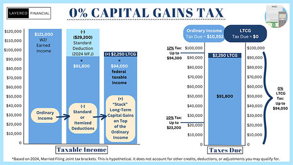 2024: You make $121,000 W2 income minus the $29,200 Married Filing Joint standard deduction equals $91,800 of taxable income. The 2024 0% LTCG tax bracket goes up to $94,050. This means you could sell stock and have up to a $2,250 LTCG (profit) and pay $0 tax on that $2,250 gain. The next day you could go back and buy those same stocks and reset your basis, so when you sell in the future, your new profit is based on that new purchase price. Higher cost basis equals a lower realized profit in the future which in turn results in a lower tax burden. What’s even better? There is no wash sale rule with harvesting gains, only when harvesting losses.