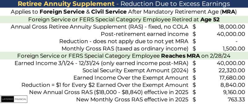 Once you hit your MRA, your RAS can be reduced or even completely eliminated depending on your earned income above the Social Security exempt amount, which for 2024 is $22,320. For every $2 you earn, the RAS is reduced by $1. This earnings test applies to everyone who reaches MRA, regardless of whether you’re Foreign Service or Civil Service. This reduction is only for your RAS, not your pension.