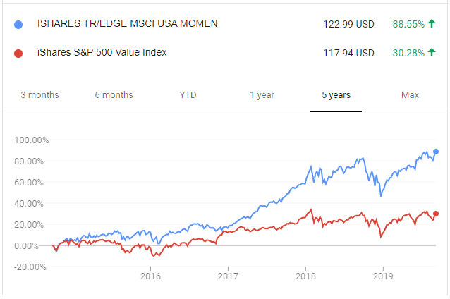 This reversal affected stocks as well, to an even sharper degree. Over the past five years, momentum stocks have completely outperformed value stocks and virtually every other asset class, including the broad S&P 500. This chart, for example, shows the iShares Momentum ETF outperforming the iShares Value ETF by 58% over the past five years: