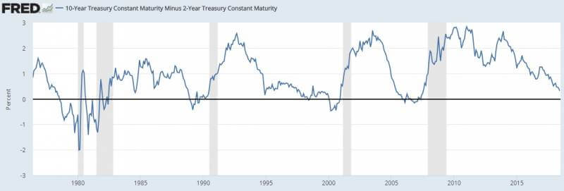 The bad news about that chart is that the yield curve is getting close to inverting, which is a strong recession indicator. The good news is that a recession usually takes about a year or more to occur after the yield curve inverts, meaning that as long as the yield curve remains positive, it means a recession has historically not been very close.