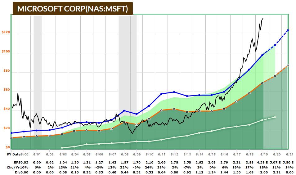 Many high-quality stocks like Microsoft, however, are highly valued, which could dampen future stock performance. On this chart below, for example, the black line represents Microsoft’s actual stock price and the blue line represents what its stock price would be if its price-to-earnings ratio was at its average over the past 20 years. The stock price has grown a lot more quickly in recent years than the company’s actual fundamentals such as earnings and dividends.