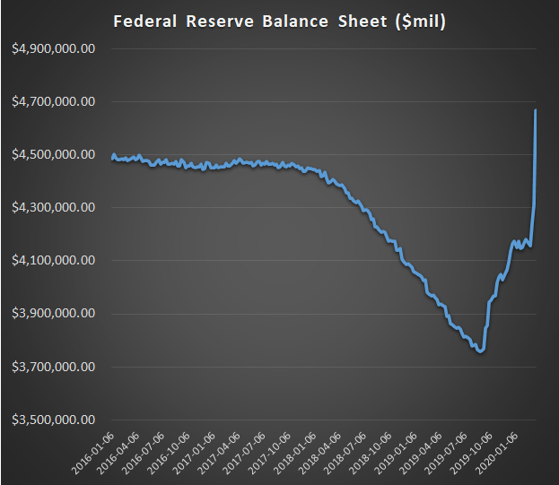 At the moment, the U.S. Federal Reserve is expanding the monetary base to buy that debt and finance U.S. fiscal deficits. After years of holding their balance sheet flat and even trying to reduce it, they are now expanding it at a record pace to monetize hundreds of billions of dollars in new debt over the past few weeks alone:
