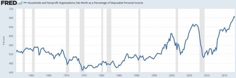 With stocks, bonds, and housing valuations all at historically high levels, the ratio of average household net worth to disposable income is higher than it ever has been in the United States: