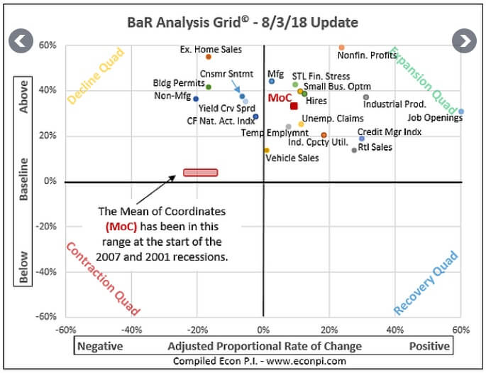 And right now, the average of 19 variables show that we’re still primarily set between the expansion quadrant and the late-stage decline quadrant. The mean of coordinates (MoC) of all the variables is still a healthy distance away from where it was shortly prior to the beginning of the 2007 and 2001 recessions.