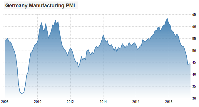 Out of all these countries, Germany is currently being struck the hardest. Although their exports as a percentage of GDP are only the second highest on the list, they are heavily focused on the automotive industry which is more cyclical than many other manufacturing industries, and currently is in a global downtrend. Therefore, although German official unemployment is very low at just 3.2% (lower than in the United States), their manufacturing purchasing manager’s index has recently fallen to a level of contraction not seen in seven years: