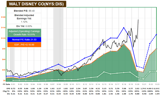 Disney stock (a member of the S&P 500, Dow, and C Fund) sums up 2020 very well. Here’s the chart, where the black line represents Disney’s share price, and the blue and orange lines represent what Disney’s earnings are doing: