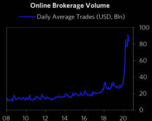 There is a lot of euphoria in the market. In particular, trading volume at online brokers (mostly representing small individual retail traders) tripled this year: