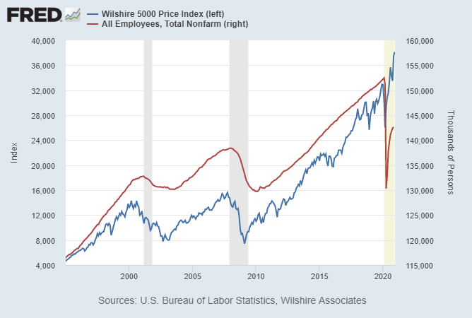 If we zoom out, we can see this happening on a bigger scale. This next chart shows the Wilshire index in blue, which represents most US stocks and is kind of like the C Fund and S Fund combined, and shows the total number of employed persons nationwide in red: