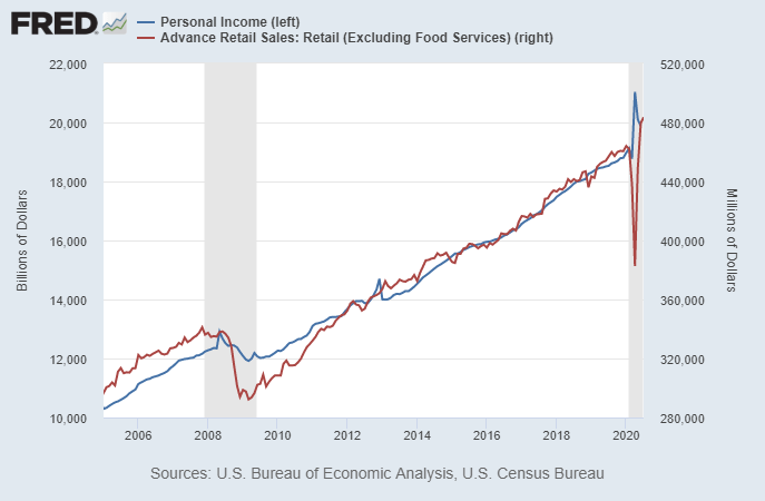 Personal income jumped straight up in this recession, and retail sales had a brief shock but then quickly rebounded to new all-time highs: