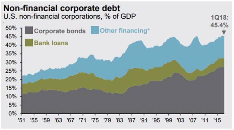 Over the last few decades, non-financial (i.e. not banks) corporate debt levels have tended to move between the upper-30’s and the mid-40’s as a percentage of GDP, depending on where we are in the business cycle. And right now, we’re on the high side of that historical range, which has generally been associated with being late in the business cycle.