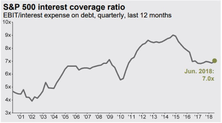 Another way to measure corporate debt levels is to use the interest coverage ratio. This ratio checks how many times larger a company’s income is compared to its current debt interest expense, and here’s the chart: